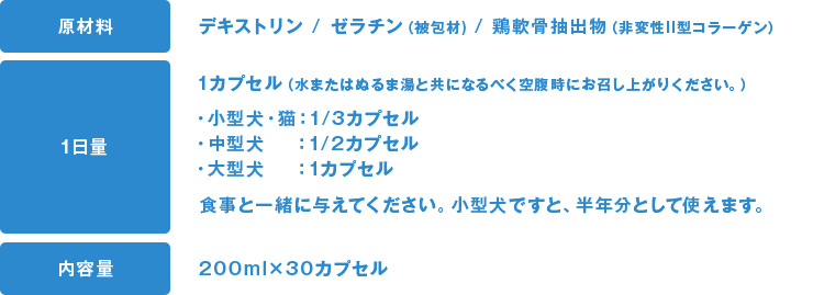 デキストリン、ゼラチン(被包材)、鶏軟骨抽出物(非変性II型コラーゲン)